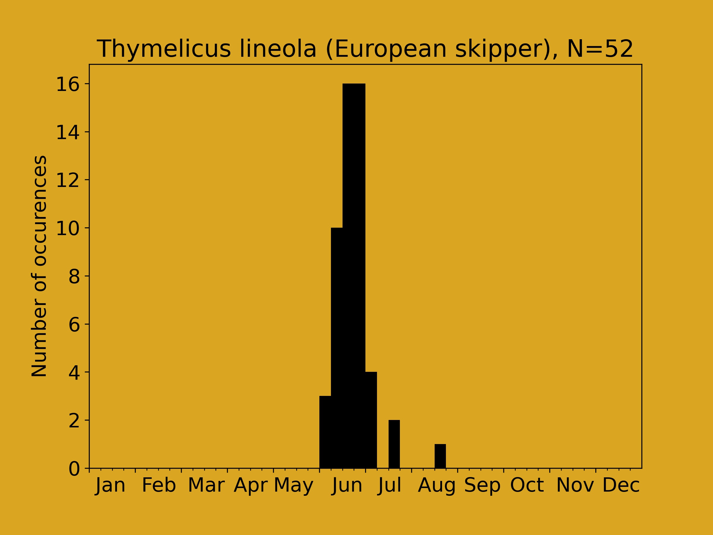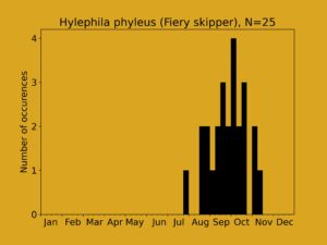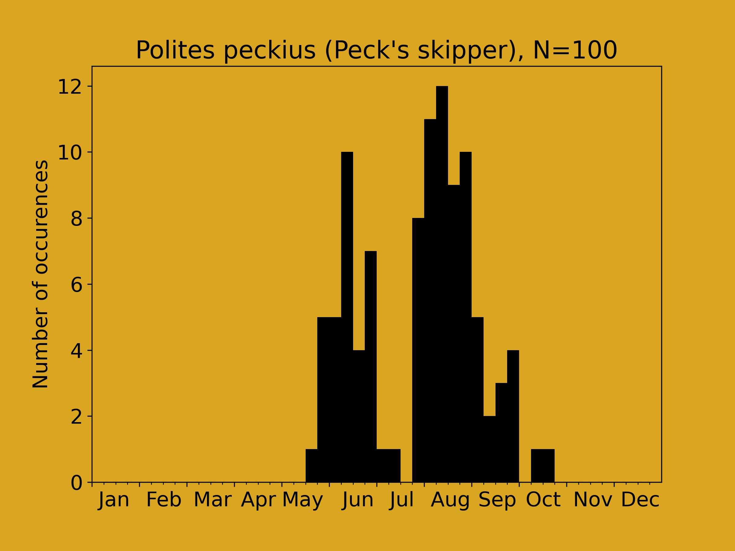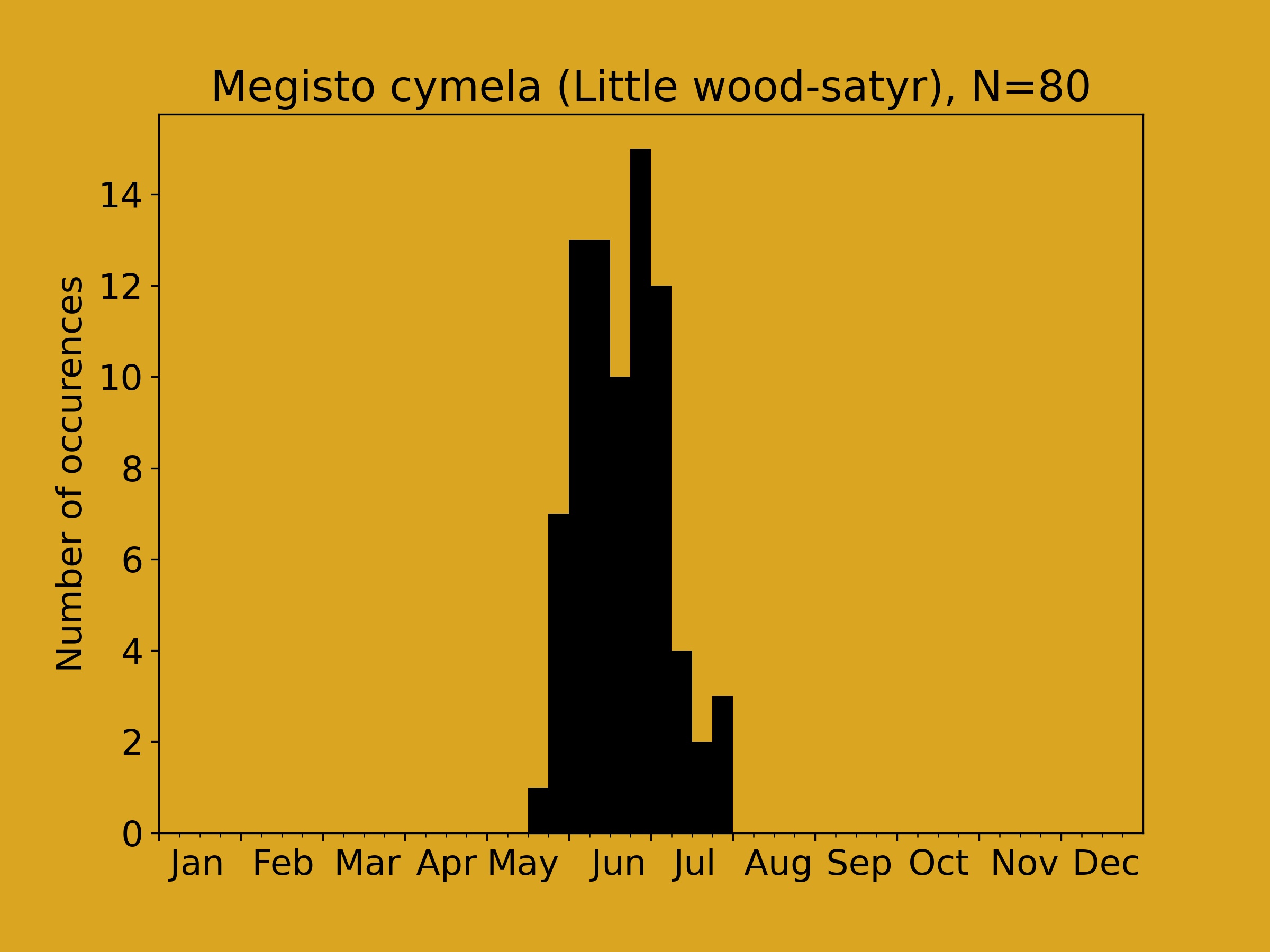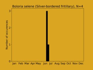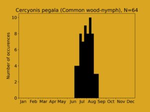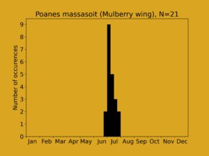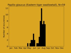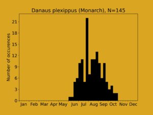 The plots next to each species show the number of times I observed the species within the state of Michigan in a given week of the year, regardless of the year. Note that the number of occurrences is independent of the number of individuals observed. If, for instance, I saw ten monarchs at a certain site on a given day, this is counted as a single occurrence. However, if I saw monarchs at two sites on the same day, that is counted as two occurrences.