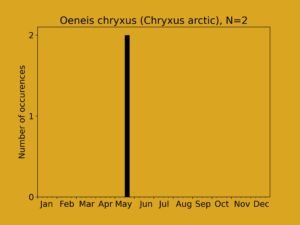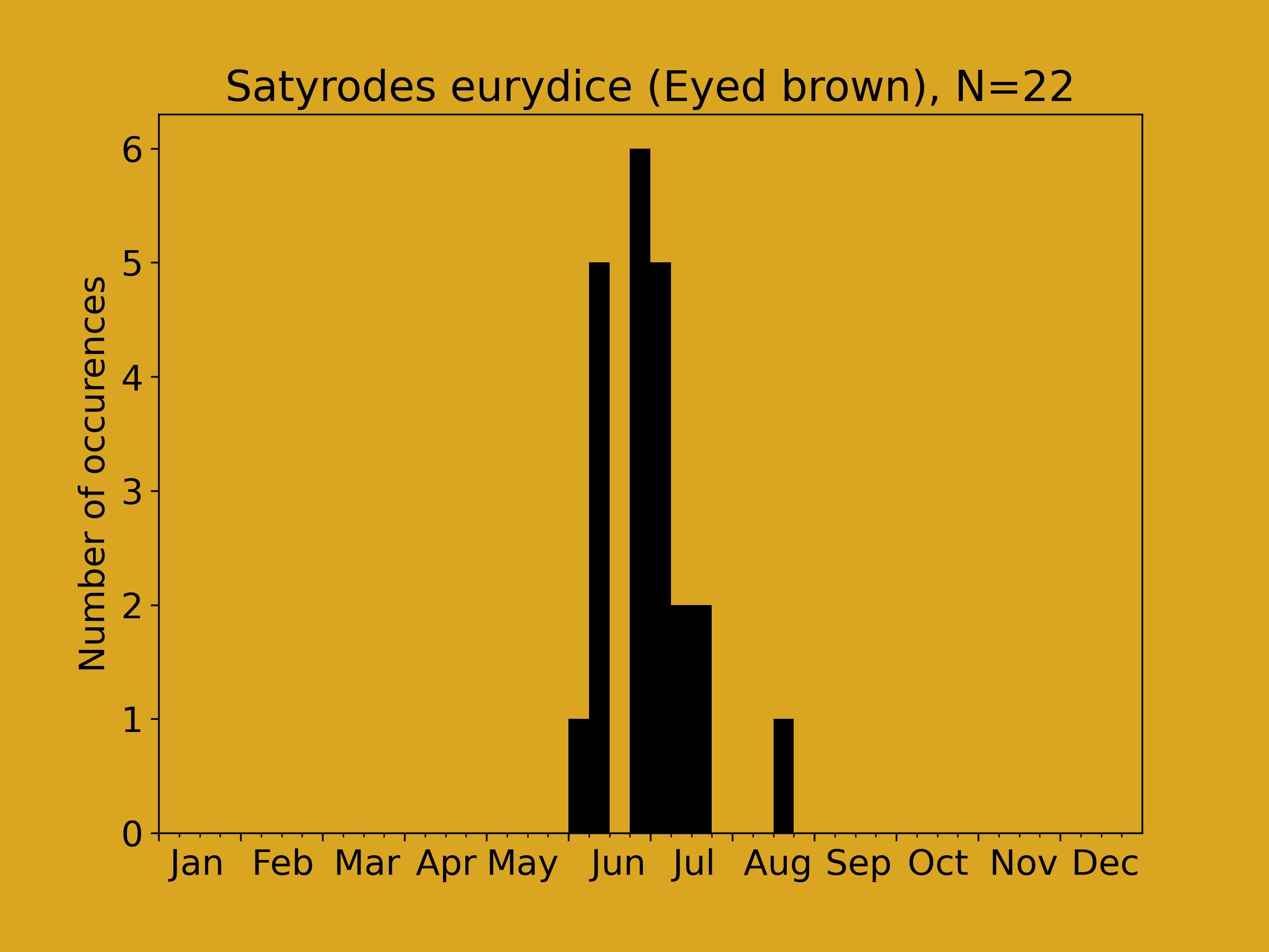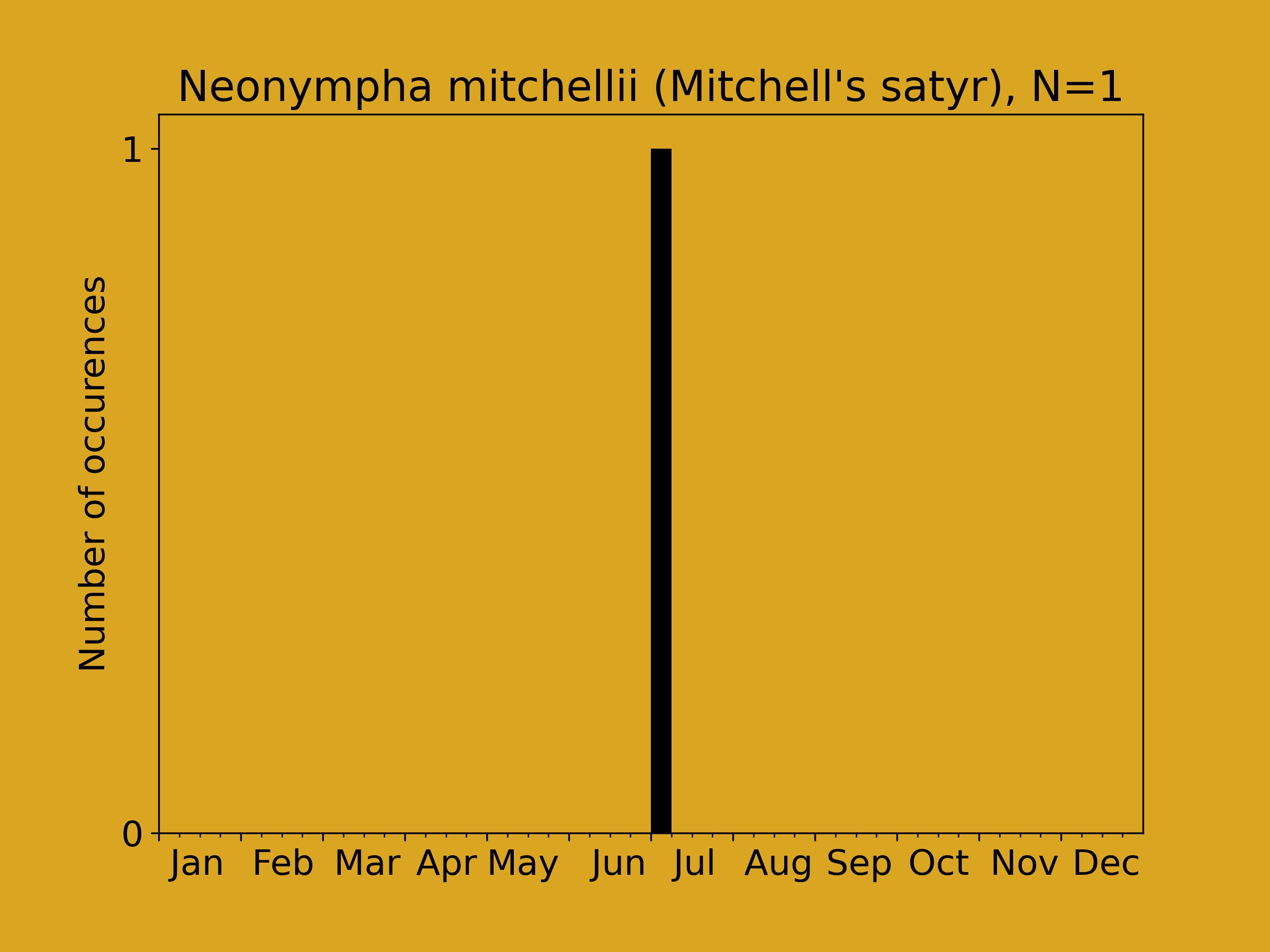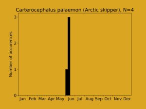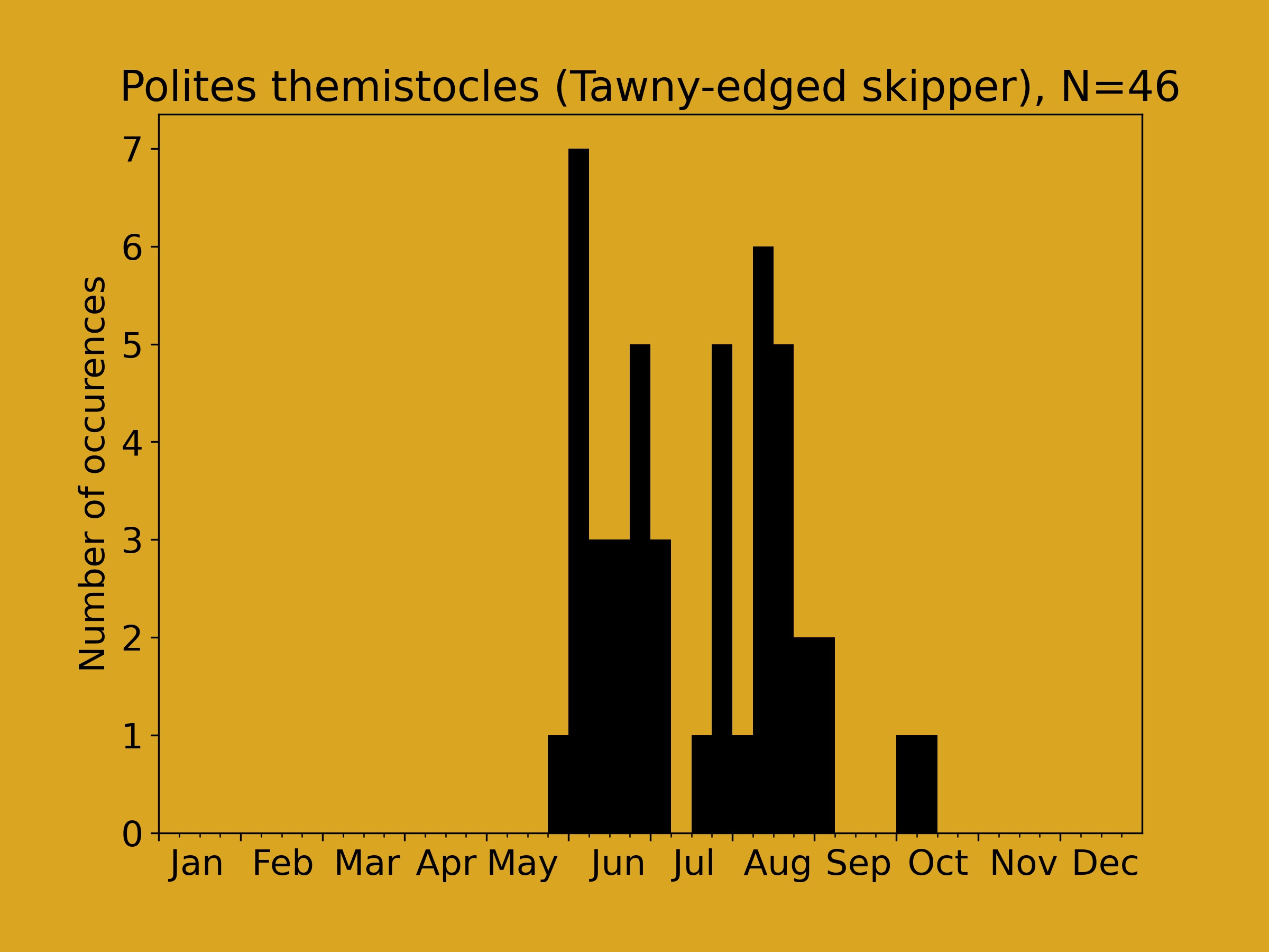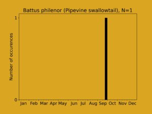 The plots next to each species show the number of times I observed the species within the state of Michigan in a given week of the year, regardless of the year. Note that the number of occurrences is independent of the number of individuals observed. If, for instance, I saw ten monarchs at a certain site on a given day, this is counted as a single occurrence. However, if I saw monarchs at two sites on the same day, that is counted as two occurrences.