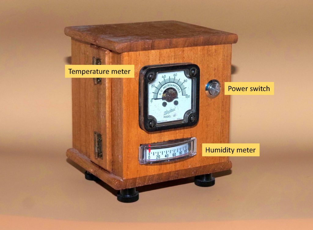 This gadget uses a sensor to measure the indoor temperature and humidity. The temperature reading is displayed on a Soviet microammeter and the humidity is displayed on a tiny MB microammeter.